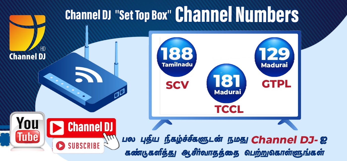 DJ SET TOP BOX AND CHANNEL NUMBERS SCV 188 (Taminadu) TCCL 181 (Madurai) GTPL 129 (Madurai) FOLLOW US ON SOCIAL MEDIA Facebook Twitter Youtube Instagram